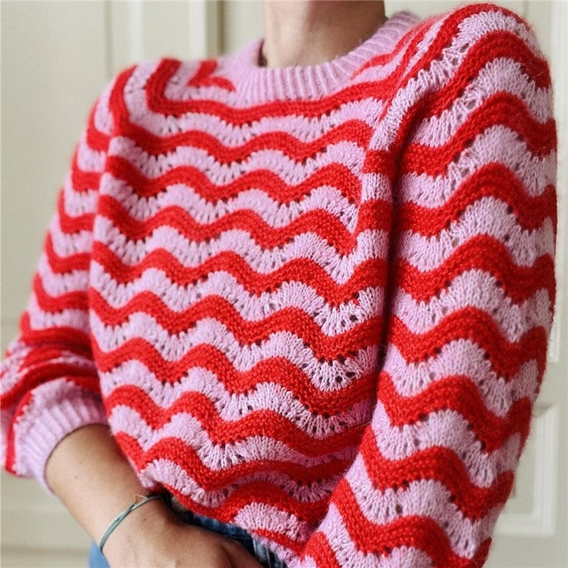 Round Neck Color Block Wave Stripe Sweater